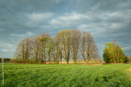 © darekb22, Fototapeta premium Spring trees on a green meadow and cloudy sky