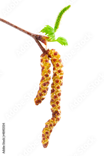 © motorolka, Obraz premium spring twig birch with green leaves and catkins, on a white back