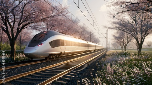 Naklejka premium Spring Velocity HighSpeed Train Racing Through Blossoming Countryside