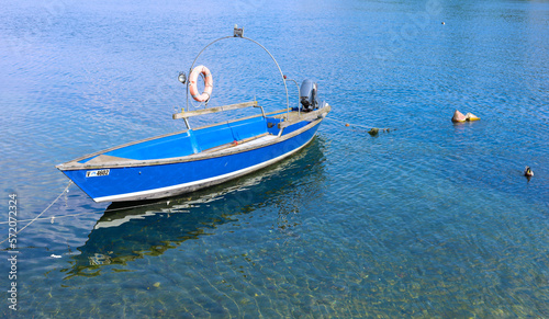 Naklejka premium Spring view landscape Italy, river, green tree, flowers, hydrangea,...