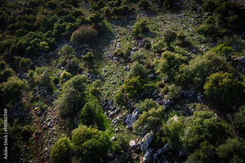 © Seersa, Fototapeta premium Spring view of Ajloun green hills and forest from inside a cable car, northern Jordan
