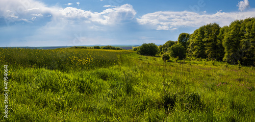 © wildman, Obraz premium Spring view with rapeseed yellow blooming fields, small grove an