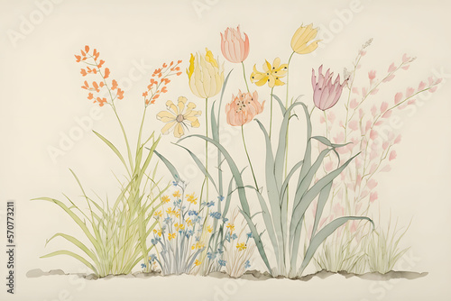 © Claire, Naklejka premium Spring Watercolor Flower Design in Muted Pastel Colors Generative AI