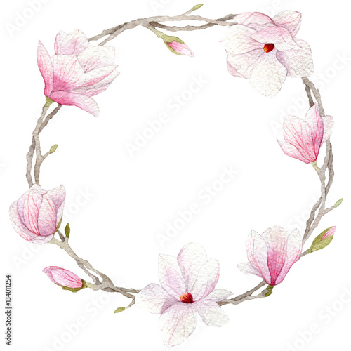 Naklejka premium spring watercolor magnolia wreath. blossoms hand drawn elements for wedding...