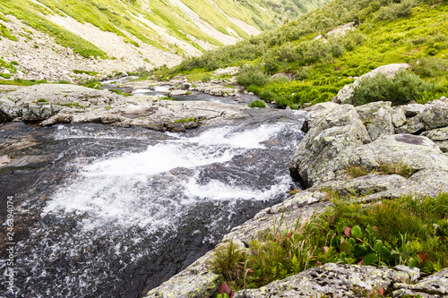 Obraz premium Spring waterfall in mountain valley. Fast river with green shores