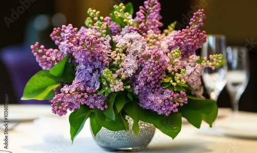 © Valentyna, Fototapeta premium Spring wedding centrer piece with purple lilacs