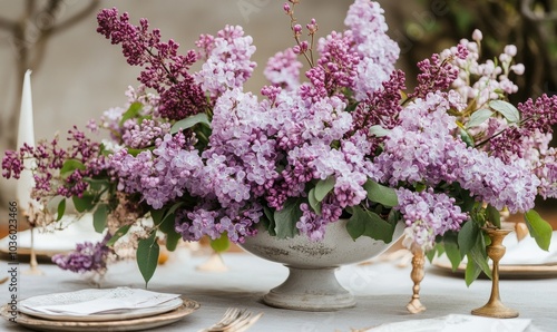 Fototapeta premium Spring wedding centrer piece with purple lilacs