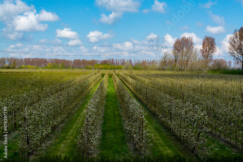 Obraz premium Spring white blossoms of pear trees on fruit orchards in Zeeland, Netherlands