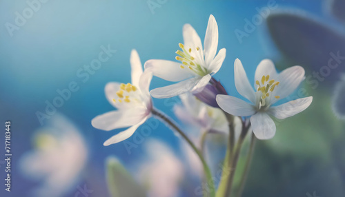 © Anastasia Knyazeva, Fototapeta premium Spring white flowers wallpaper on a blurred blue background macro in the forest