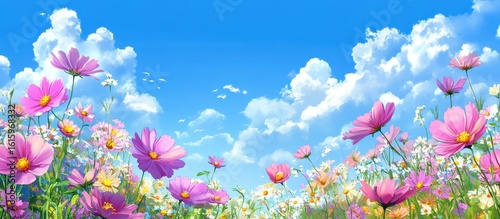 © mdhimel, Obraz premium Spring Wildflower Meadow with Vibrant Cosmos Blooms under Bright Sunlight