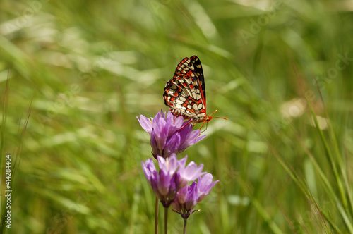 Obraz premium Spring wildflowers and a butterfly enjoying the morning.