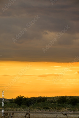 © Andrew, Obraz premium Springbok grazing in the dry Nossob river bed, Kgalagadi Transfrontier Park