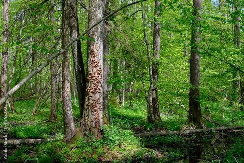 © Aleksander Bolbot, Obraz premium Springtime alder-bog sunny forest with standing water