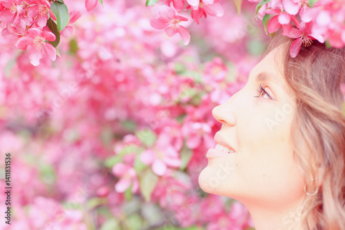 © kichigin19, Fototapeta premium Springtime background, a woman in pink in a blooming cherry orchard, a model posing in a romantic style