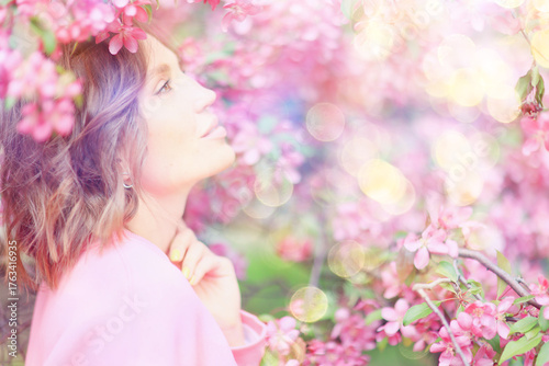 Fototapeta premium Springtime background, a woman in pink in a blooming cherry orchard, a model...