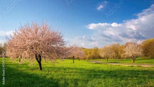 Fototapeta premium Springtime bloom of trees on a lush meadow