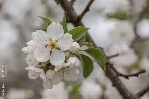 Obraz premium Springtime blossoming of a plum tree flower with a gentle breeze causing...