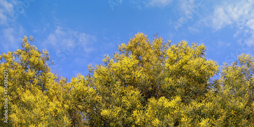 Fototapeta premium Springtime. Bright yellow flowers of Acacia dealbata tree against sky