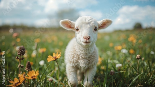 © AugmentArt, Obraz premium Springtime close-up of a young sheep in a vibrant meadow