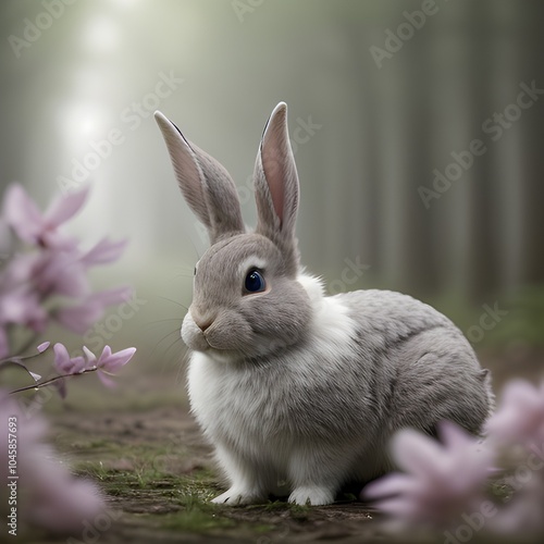 Fototapeta premium Springtime Companion: A Gray Rabbit Among Blossoms and Grass