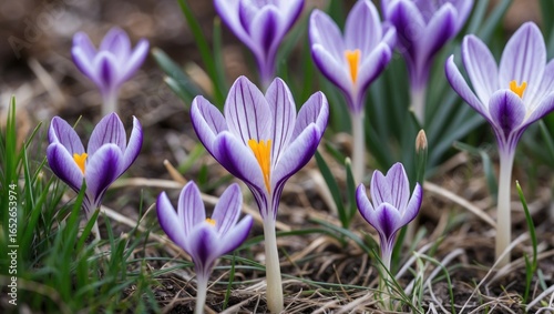 © Emin, Fototapeta premium Springtime crocus with purple and white striped petals in full bloom