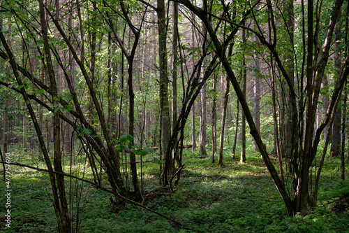 Obraz premium Springtime deciduous tree stand with hornbeams and oaks
