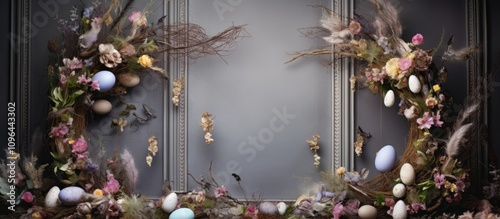 Fototapeta premium Springtime Easter backdrop with floral wreaths colorful eggs and delicate feathers for festive celebrations and decorations