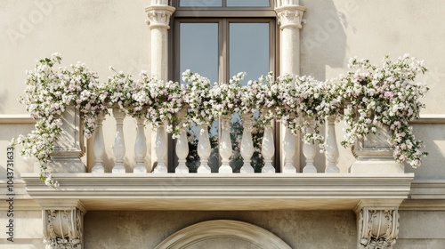 Naklejka premium Springtime Elegance Captivating View of Classical Architecture Featuring a Wall Pillars and Balcony Adorned with a Floral Arch