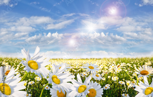 © doris oberfrank-list, Obraz premium Springtime: field of daisy flowers with blue sky and clouds