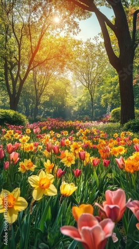 © KebonBibit, Obraz premium Springtime floral path through a park with sunlight