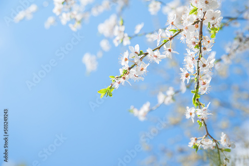 © Nelly, Fototapeta premium Springtime greeting card and copy space. Blooming spring trees close up.