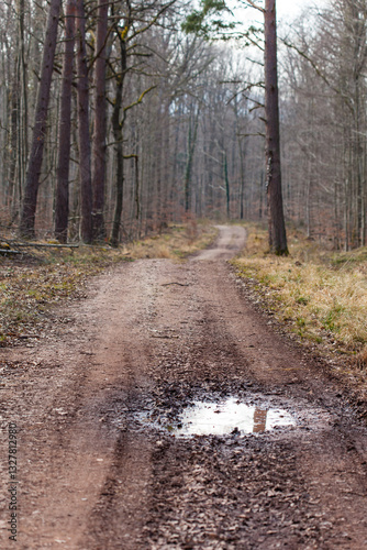 Fototapeta premium Springtime in forest with sand road and puddle