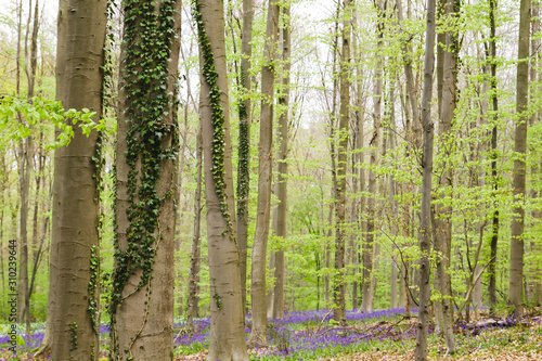 Fototapeta premium Springtime landscape in a forest with beech trees and bluebells blooming