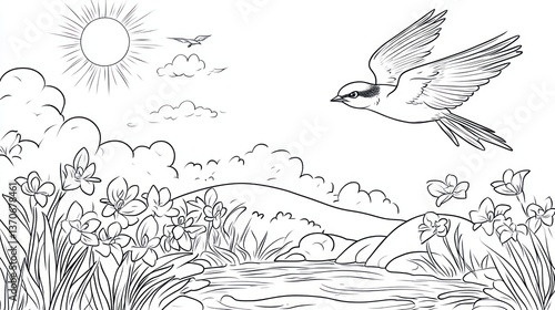 © Mundhut, Obraz premium Springtime landscape with a bird in flight. Coloring book illustration
