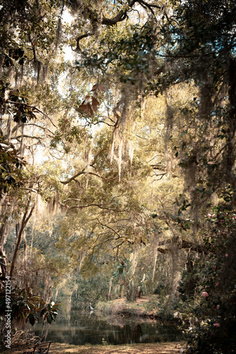 Fototapeta premium Springtime landscape with trees, Spanish moss and pond