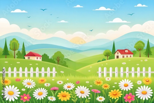 © Redoy, Fototapeta premium Springtime Meadow Landscape with Houses