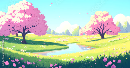 Fototapeta premium Springtime Meadow with Cherry Blossoms