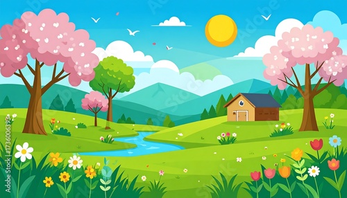 © Siti, Fototapeta premium Springtime rural landscape with flowering trees