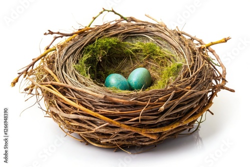 © Autun, Obraz premium Springtime's delicate avian nest, meticulously crafted, sits alone against a stark white backdrop; a high-resolution wildlife image.