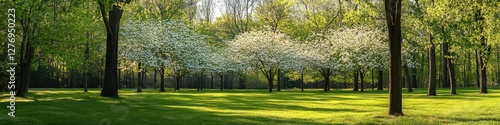Fototapeta premium Springtime Tapestry: Flourishing Dogwood Trees and Vibrant Foliage in the...