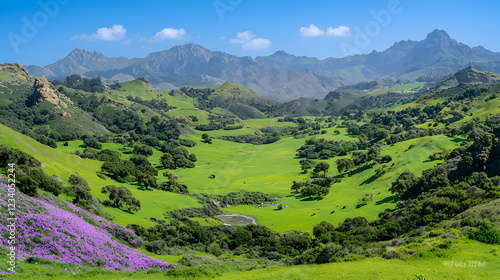 Naklejka premium Springtime valley, mountain range backdrop, wildflowers