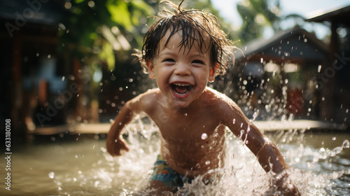 © Danny, Obraz premium Sprinkler Delight: Uplifting Playtime with a Little Boy in Backyard