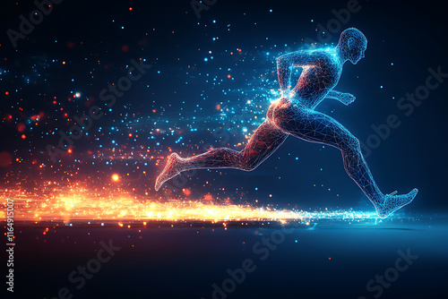 Fototapeta premium sprinter in full stride, showcasing speed, determination, and athleticism. The design captures the energy of competition with motion lines and glowing accents, rendered in a sleek low-poly style