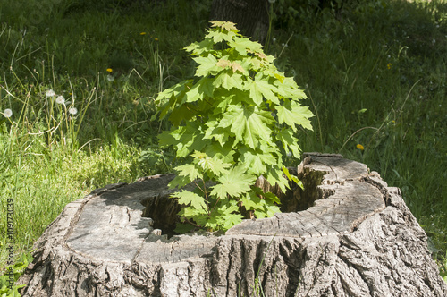 © varbenov, Obraz premium Sprouted sapling in cut oak tree log closeup