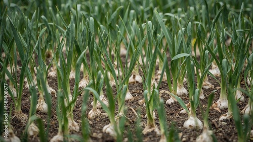 © Giovanni, Fototapeta premium Sprouting garlic in an organic garden bed. Focus on sustainable agriculture and preserving nature.