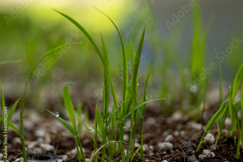 © jgdanwoo, Fototapeta premium Sprouts of rice after rain, close-up