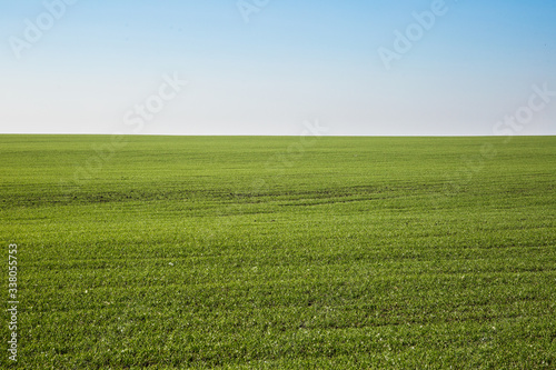© Iren Moroz, Naklejka premium Sprouts of winter wheat sprouted in an endless field