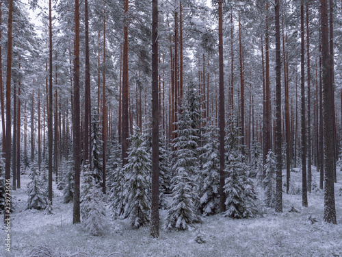 © Conny Sjostrom, Fototapeta premium Spruce and pine tree forest covered by fresh snow during winter Christmas time