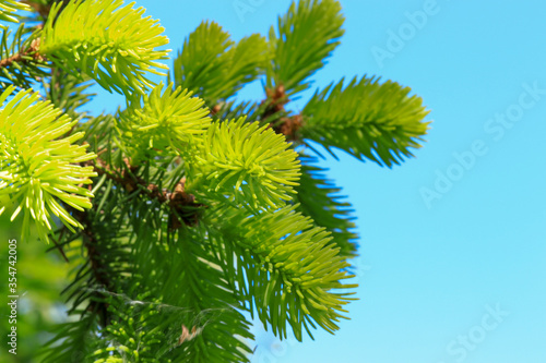 © Vitaly, Fototapeta premium spruce, delicate green color, blue background