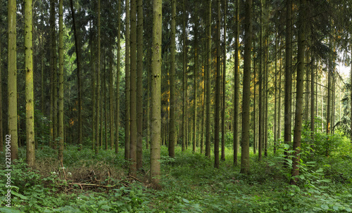 © ihorhvozdetskiy, Fototapeta premium spruce forest in the plain. artificial spruce forest